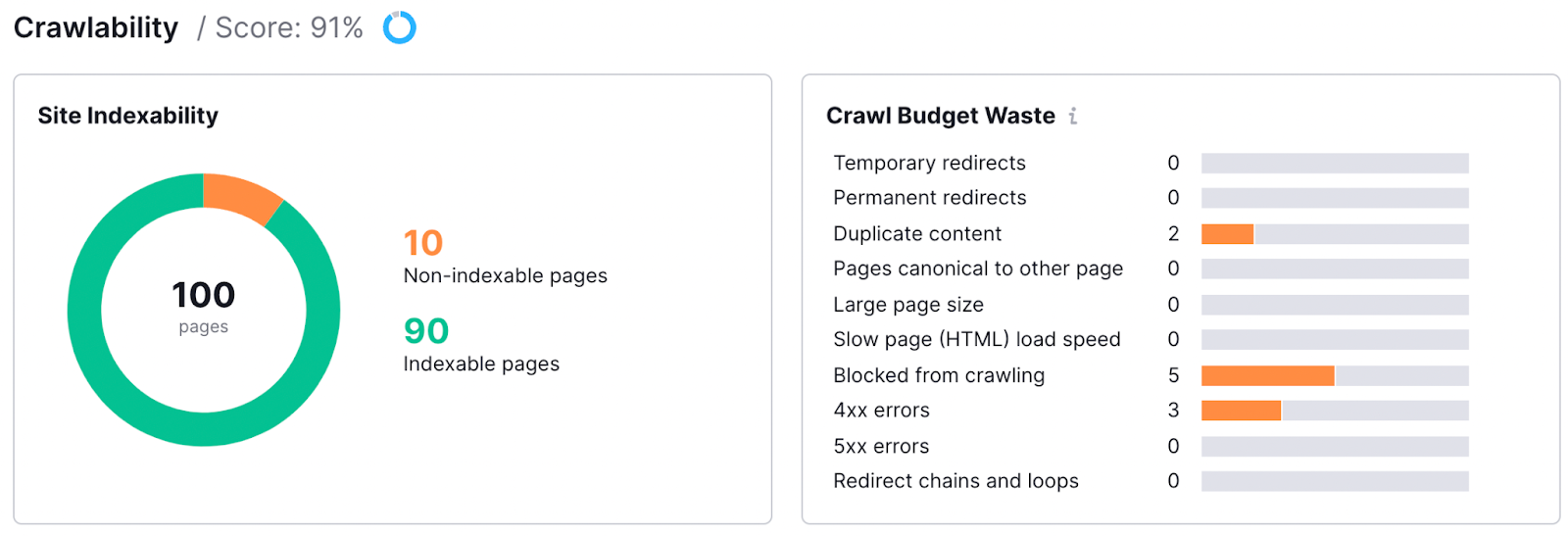 Semrush 网站审计仪表盘,显示抓取和索引指标,包括可索引和不可索引页面。