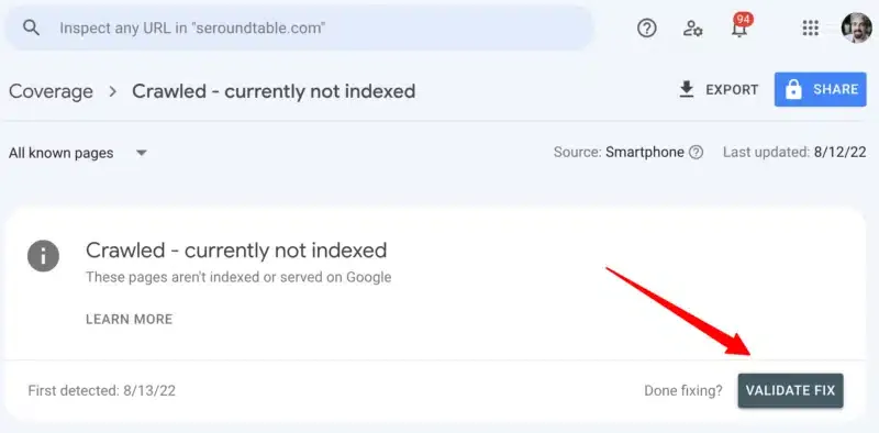 Google Search Console 截图,显示“已抓取 - 当前未索引”状态和“验证修复”按钮。