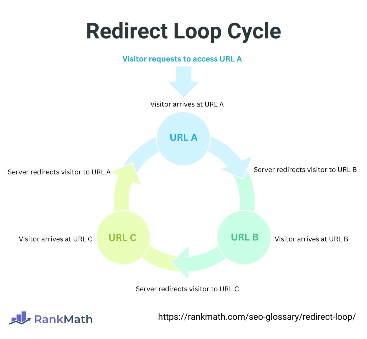 此图展示了一个重定向循环,访问者从 URL A 重定向到 B,再到 C,最后又回到 A,形成无限循环。
