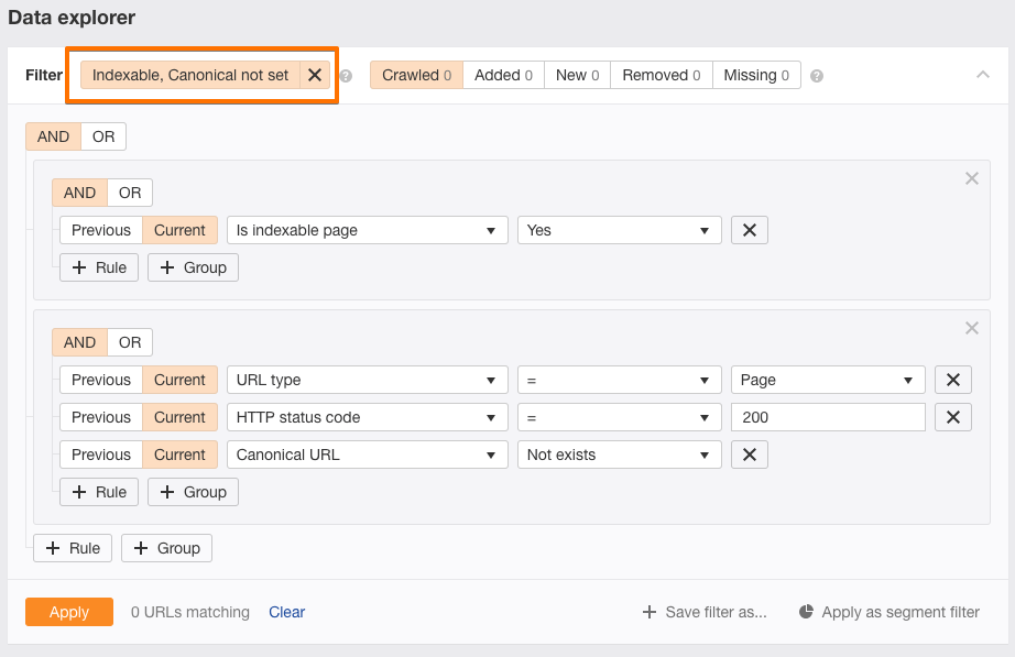 Ahrefs 网站审计数据浏览器截图,显示索引性和规范问题的筛选器。